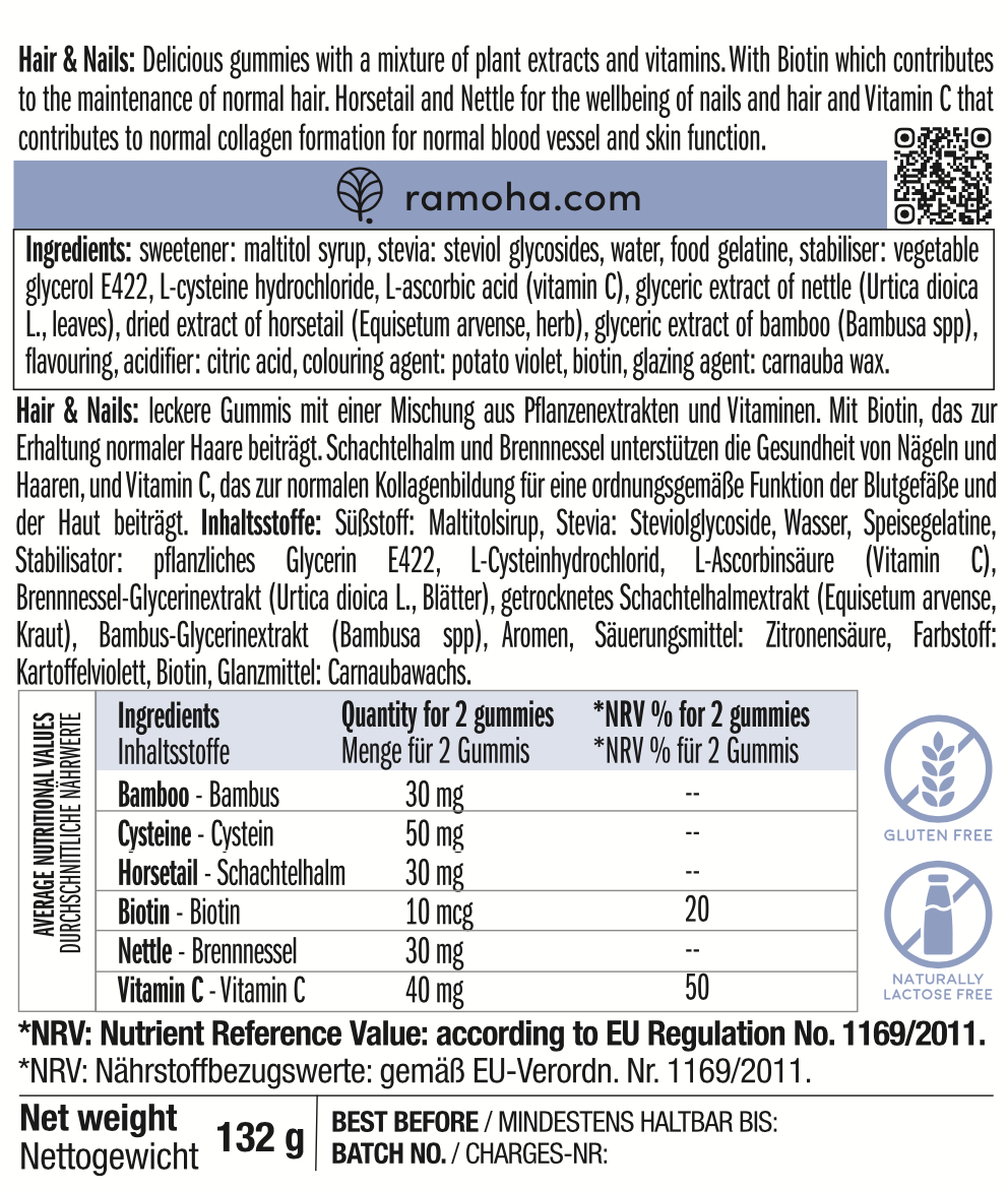 Edulcoranti: sciroppo di maltitolo, stevia: glicosidi steviolici, acqua, gelatina alimentare, stabilizzante: glicerolo vegetale E422, L-cisteina cloridrato, acido L-ascorbico (vitamina C), estratto glicerico di ortica (Urtica dioica L., foglie), estratto secco di equiseto (Equisetum arvense, erba), estratto glicerico di bambù (Bambusa spp), aromi, acidificante: acido citrico, colorante: patata viola, biotina, agente di rivestimento: cera carnauba.