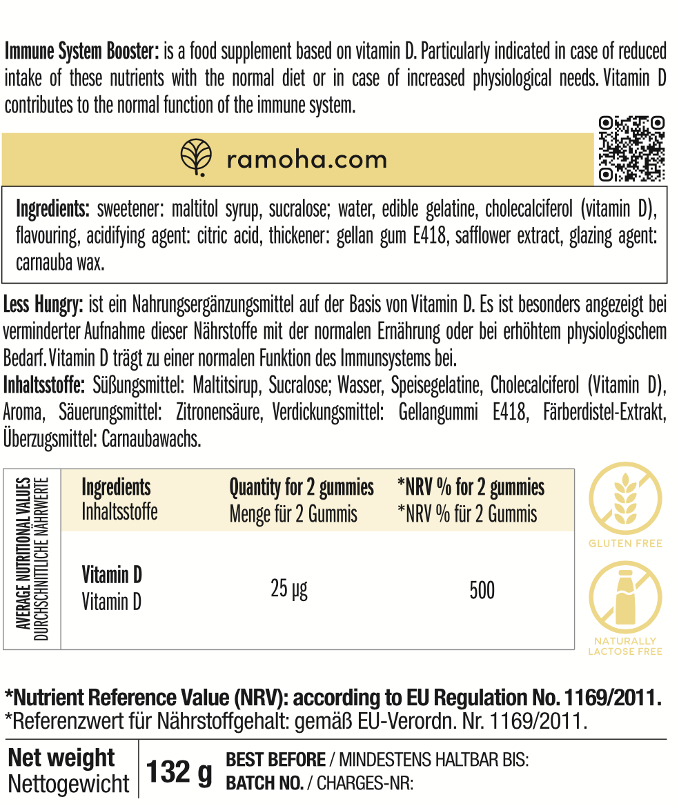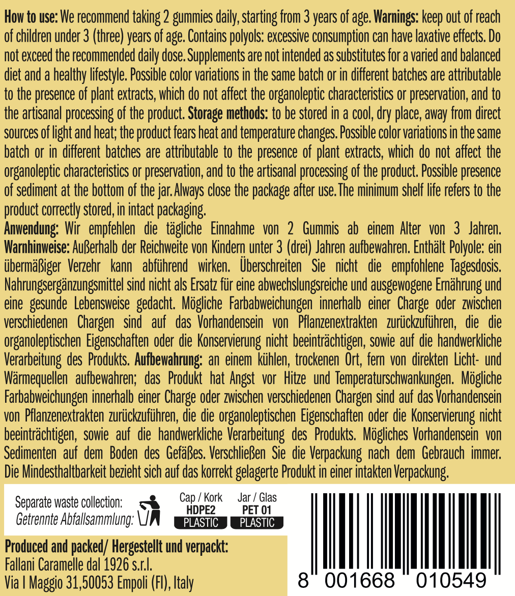 Si consiglia l’assunzione di 2 gummies al giorno, pari a 5 µg (200 UI) di Vitamina D, che coprono il 100 % del valore nutritivo di riferimento.