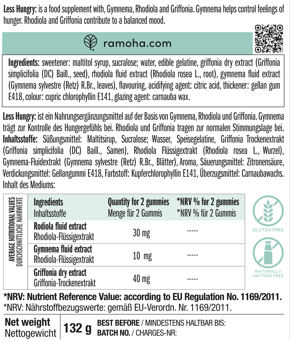 Edulcoranti: sciroppo di maltitolo, sucralosio; acqua, gelatina alimentare, estratto secco di griffonia (Griffonia simplicifolia (DC) Baill., seme), estratto fluido di rodiola (Rhodiola rosea L., radice), estratto fluido di gymnema (Gymnema sylvestre (Retz) R.Br., foglie), aroma, acidificante: acido citrico, addensante: gomma di gellano E418, colorante: clorofillina rameica E141, agente di rivestimento: cera di carnauba.