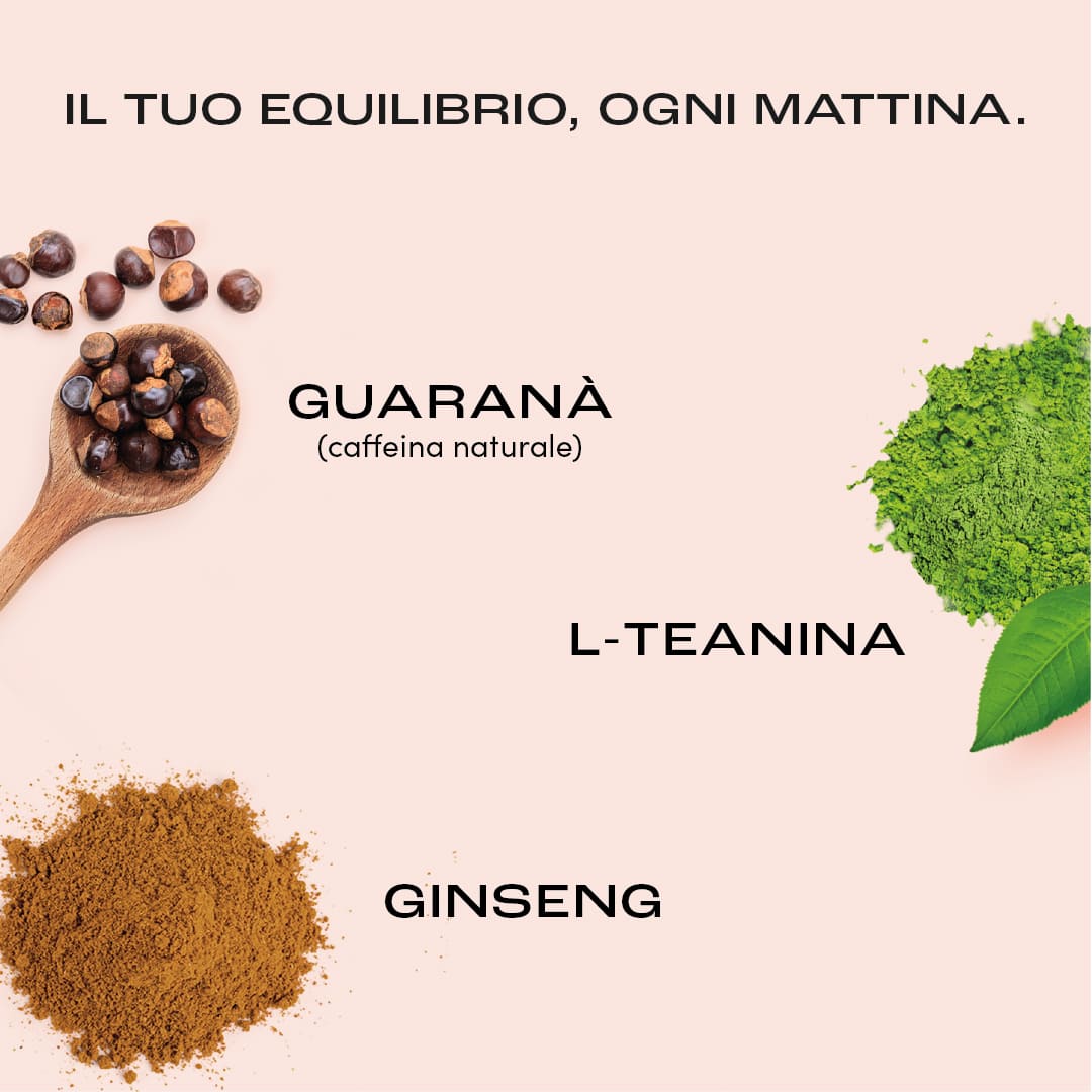 • L-Teanina favorisce concentrazione ed equilibrio mentale, soprattutto in combinazione con la caffeina naturale del guaranà.