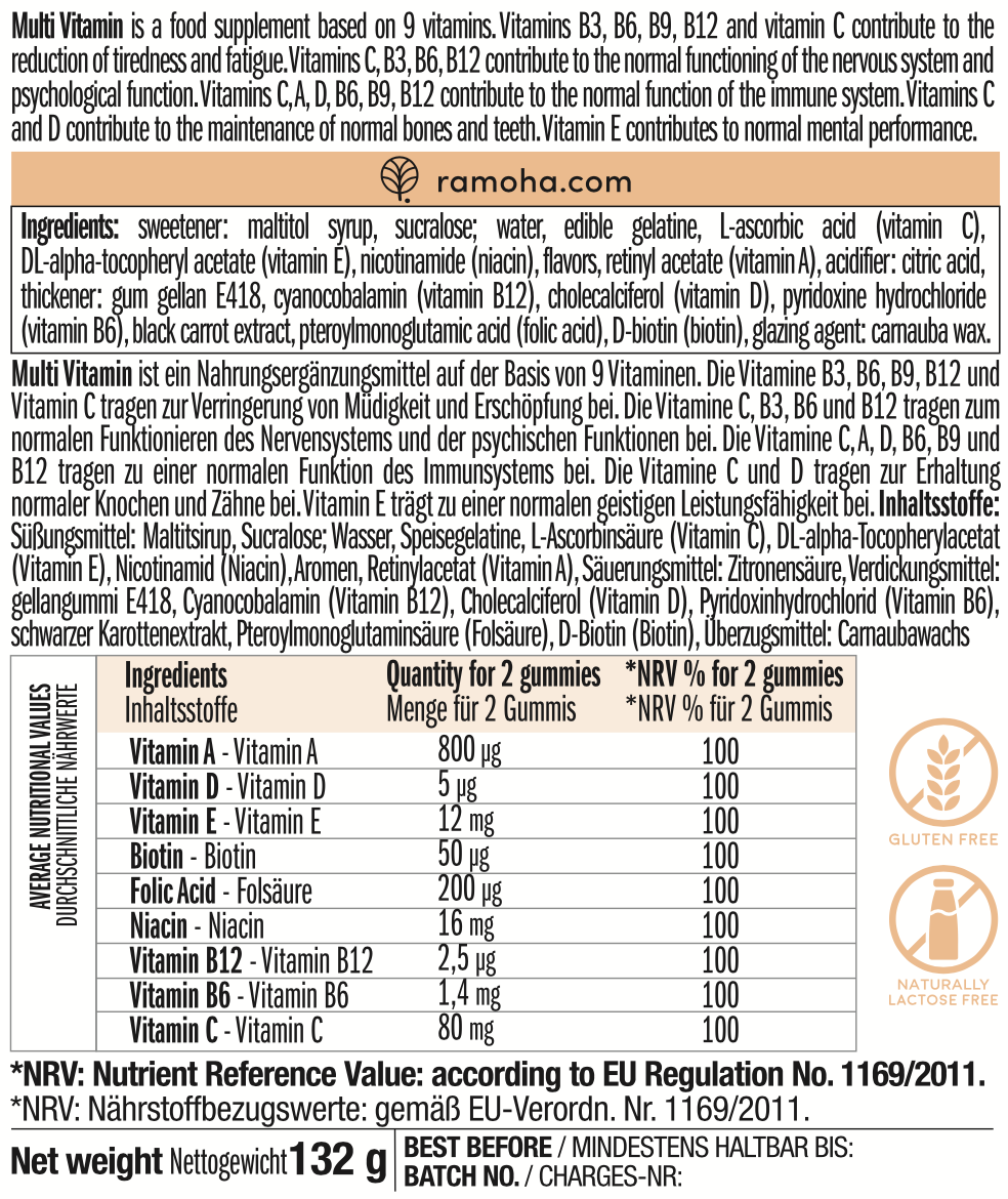 Integratore alimentare in formato gummy con 9 vitamine: A, D, E, C, B6, B12, Biotina, Acido folico e Niacina.